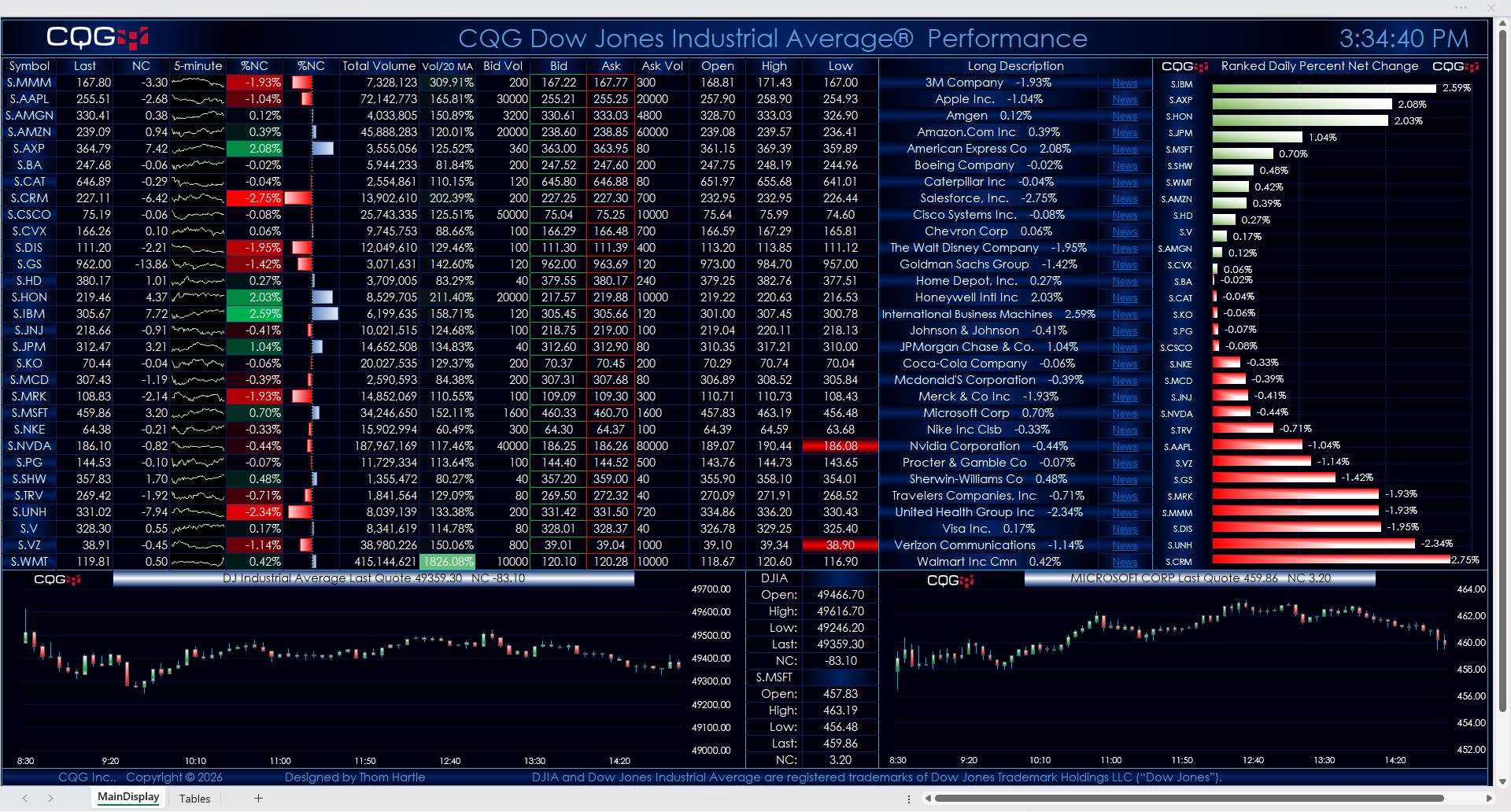 Throughout the trading session, the thirty individual stocks are dynamically ranked and displayed in the histogram bar chart with their respective net percent change for today's trading session.