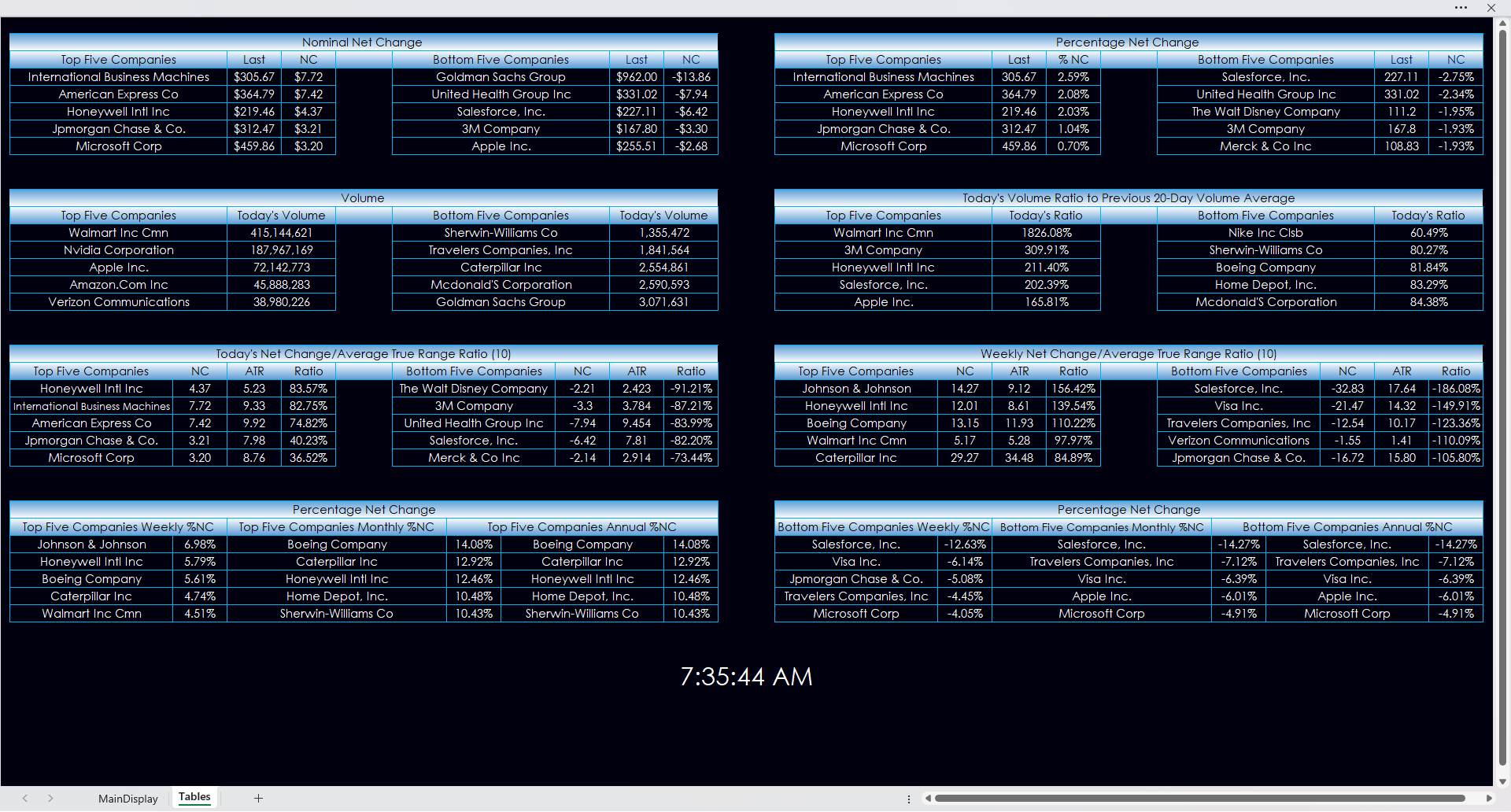 The tab Tables is pulling in market information from the Main Display and a data tab.