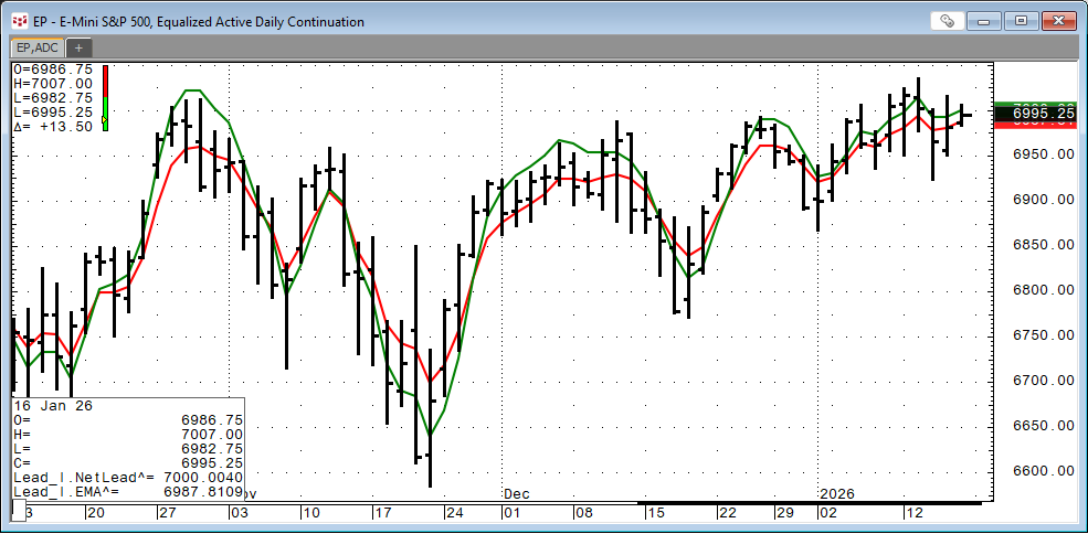 In Mr. Ehlers Book “Cybernetic Analysis for Stocks and Futures” the “Leading Indicator” was introduced. The goal of this study was to smooth the price action while not having the lag by the study that is inherent in typical moving averages. The chart below displays the NetLead study (the green line) and an exponential moving average (the red line).
