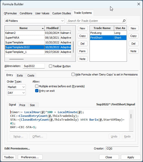 The Super Template is installed in CQG’s Trade Systems under the Formula Builder.