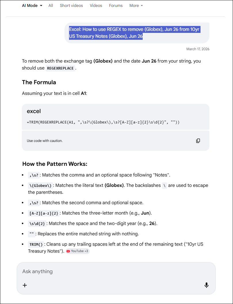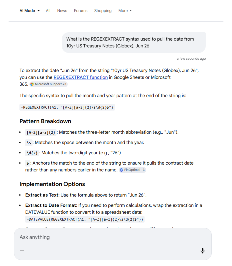 The "Pattern" requires using a "Regular Expression" to find the text in the original string. We can use AI to determine the Pattern needed for the regular expression. Simply, ask Google AI Mode for the complete function.