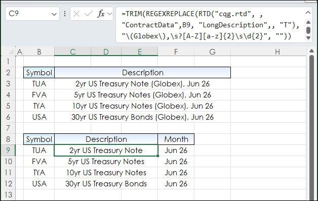 =REGEXEXTRACT(RTD("cqg.rtd", ,"ContractData",B9, "LongDescription",, "T"), "[A-Z][a-z]{2}\s\d{2}")The image below compares the use of the RTD call for the Long Description (top section) and the use of the REGEXREPLACE and REGEXEXTRACT (the bottom section). A column was gained.