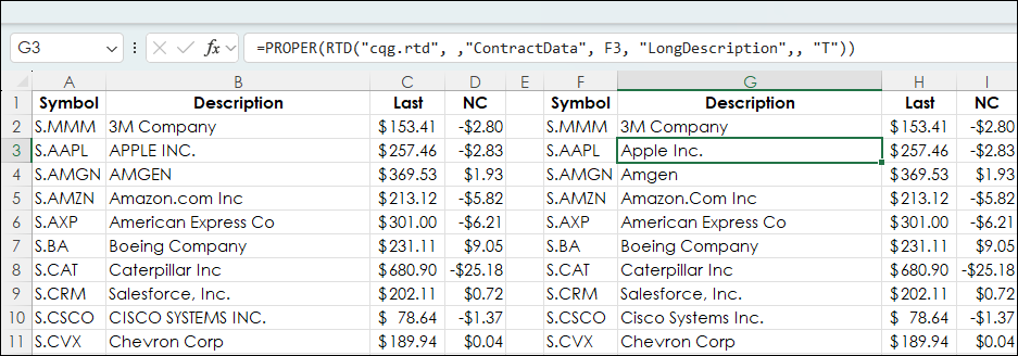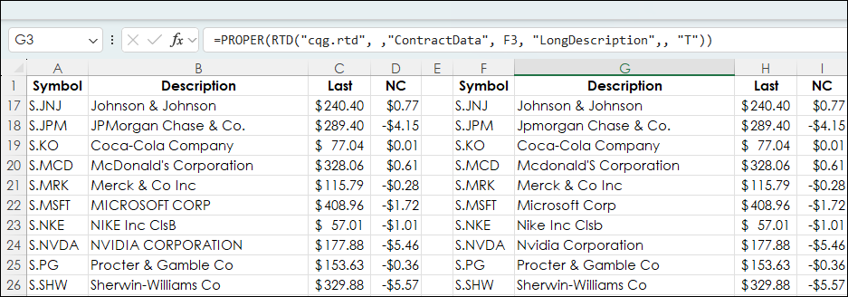 CQG IC and QTrader users who connect to Excel using RTD functions for market dashboards can use the PROPER Function to build a cleaner looking display of maret data.
