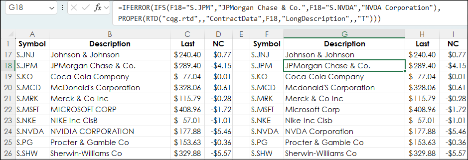 =IFERROR(IFS(F18="S.JPM","JPMorgan Chase & Co.",F18="S. NVDA","NVDA Corporation"),PROPER(RTD("cqg.rtd",,"ContractData",F18,"LongDescription",,"T")))Another edge case is if the symbol is a SPDR (Standard & Poor's Depositary Receipt) such as for symbol S.XLRE the long description is "Real Estate Select Sector SPDR" but the Proper function returns "Real Estate Select Sector Spdr."
