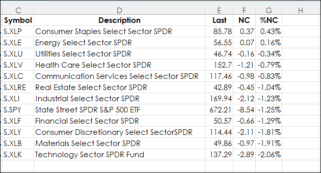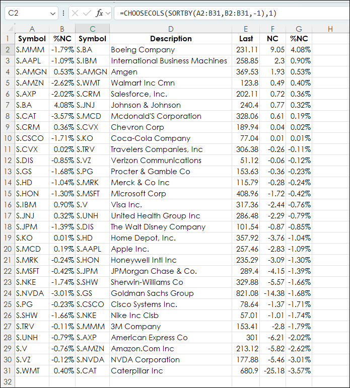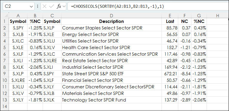 =IF(ISERROR(FIND("SPDR",RTD("cqg.rtd", ,"ContractData", C2, "LongDescription",, "T"))),PROPER(RTD("cqg.rtd", ,"ContractData", C2, "LongDescription",, "T")),RTD("cqg.rtd", ,"ContractData", C2, "LongDescription",, "T"))One solution would be to simply hard code all the descriptions. However, the sample dashboard has three tabs" DJIA, Sectors, and NASDAQ 100. Each tab is sorting the symbols by percent net change in Column C. The technique is detailed in "Excel Combining SORTBY, CHOOSECOLS, and TAKE Functions".