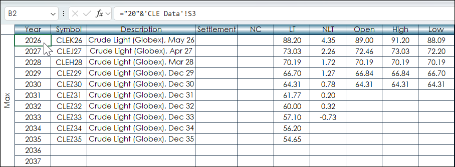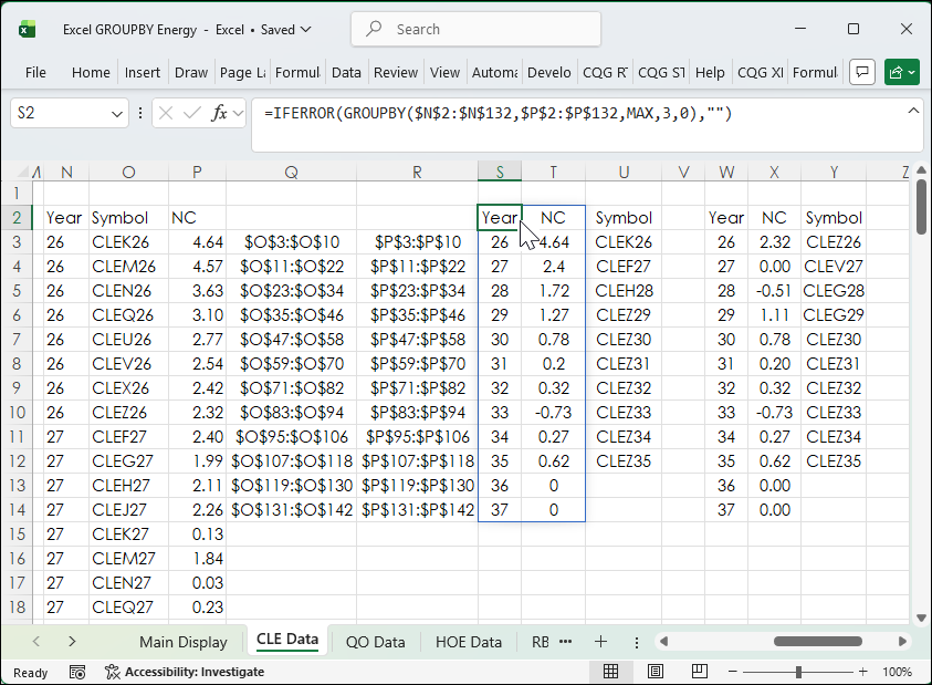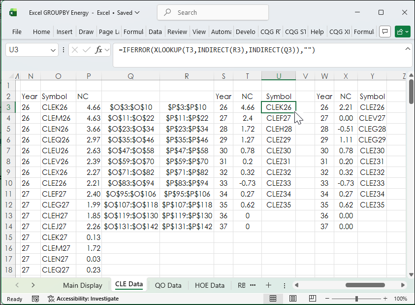Notice below the XLOOKUP is using the INDIRECT function for the parameters. This confines the XLOOKUP Function to search for the symbol that matches the net change range within the same year. This is because the XLOOKUP function will return the symbol upon the first time it sees the first matching net change value, which might be in an earlier year. Columns Q and R will automatically adjust the range when the contracts roll.