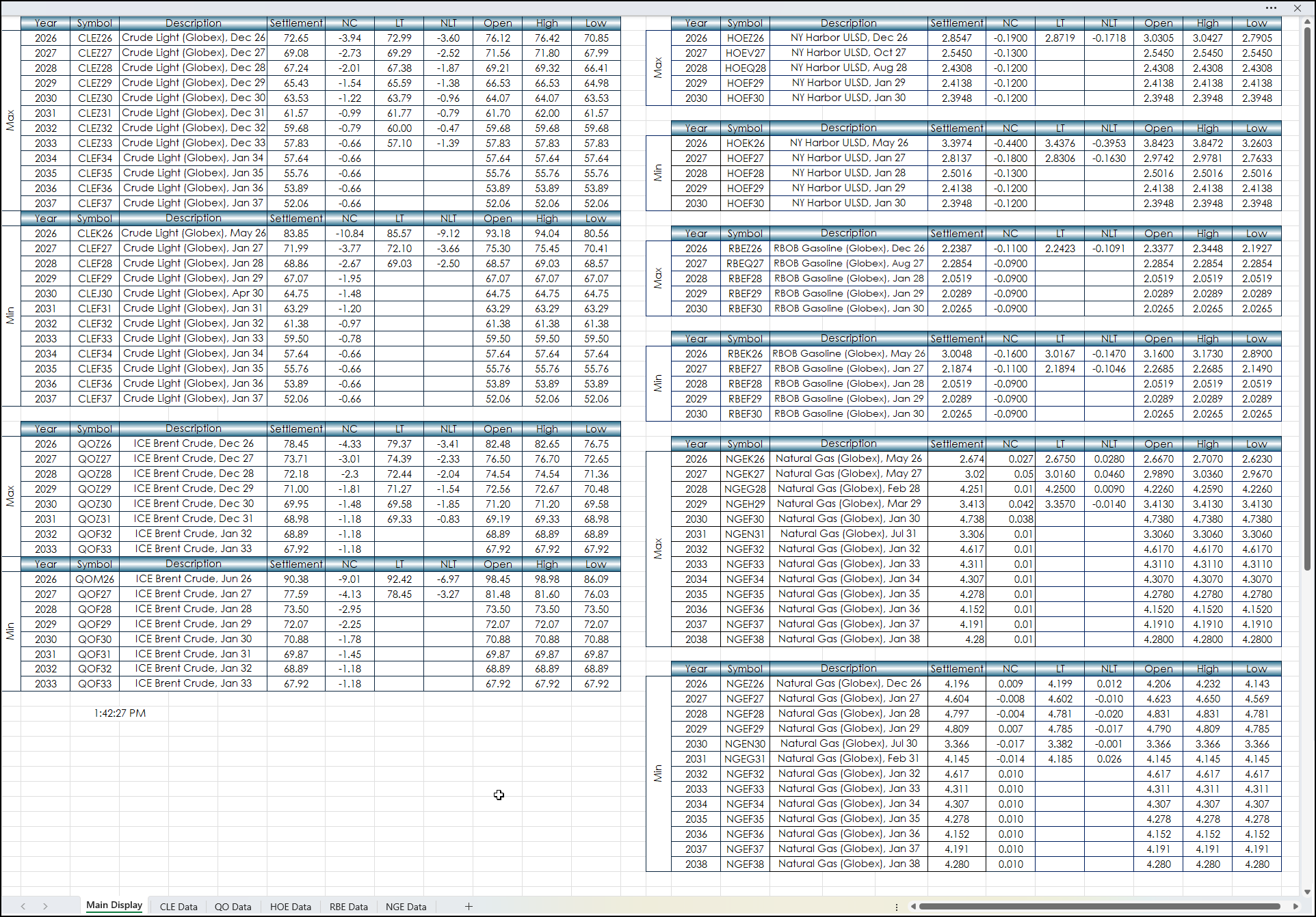 All of this data is used on the Main Display tab. The data is pulled into blocks. There are two blocks for each market, a Max block and a Min block. During the trading session the net change is used for the GROUPBY function.