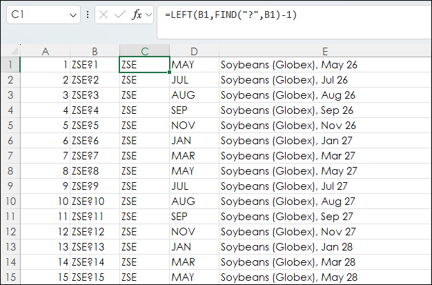 =LEFT(B1,FIND("?",B1)-1)Column C is the wildcard version for the group and Column D is the contract month using column B.