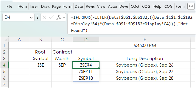 =RTD("cqg.rtd", ,"ContractData",B1, "ContractMonth",, "T")On the Display tab the Filter function is used to find the symbol based on the root symbol in cell B4, B10, B16, etc., and the month in cell C4 , C10, C16, etc., from the Data tab.