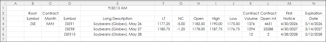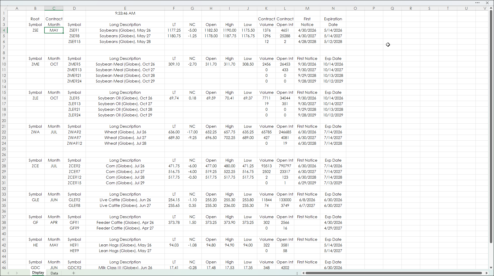 The symbols for each month within the group are pulled from the Data tab to the Display tab. For example, at the time of this writing, for symbol ZSE and the month SEP entered in the Display tab returns symbols for Soybeans (Globex), Sep 26, Soybeans (Globex), Sep 27, and Soybeans (Globex), Sep 28.